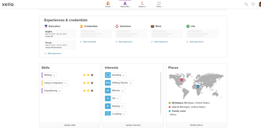 2. In addition, students should complete the Experiences & credentials, Skills, Interests, and Places sections in Xello.
