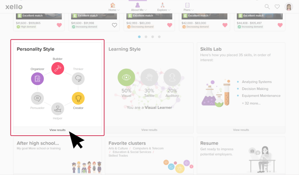 1. To work on fulfilling the requirements of the Talent Portfolio, students should complete their About Me profile in Xello. Here they’ll complete assessments to learn more about themselves including their Personality Style and Skills Lab Assessments.