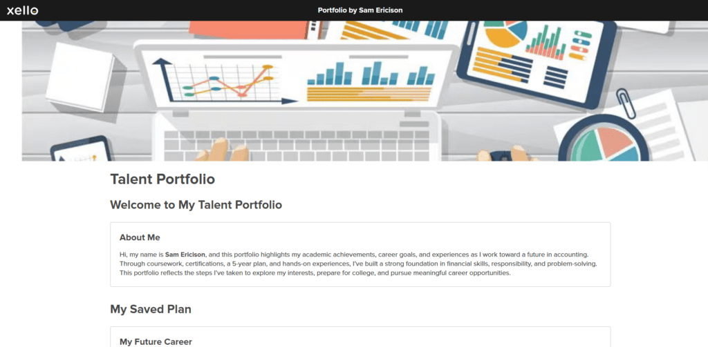 3. Finally, students can curate their Talent Portfolios using Xello Portfolios to collect and present information and artifacts they’ve gathered and created that demonstrate their talents and marketable skills.